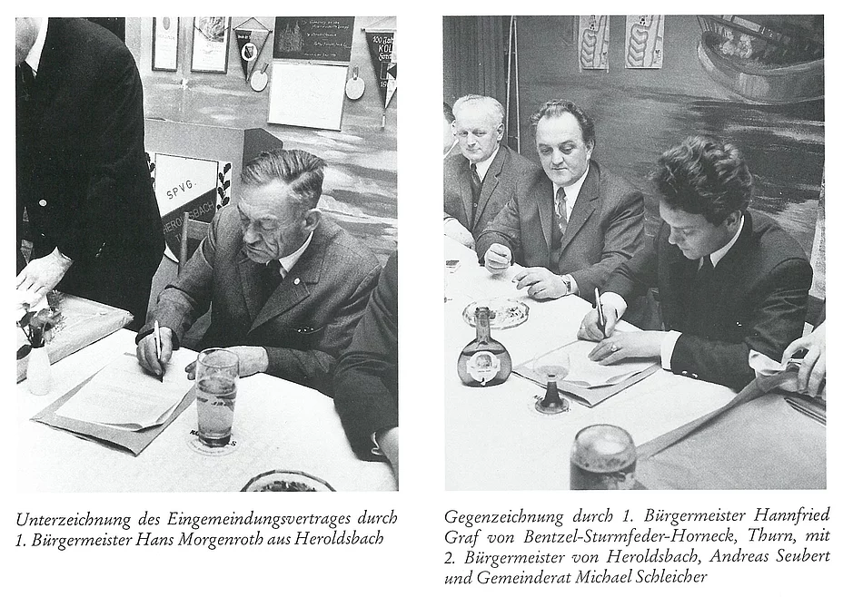 „Mich freut es, dass wir über all die Jahrzehnte so gut zusammengewachsen sind“, so Bürgermeister von Bentzel (CSU). Von Bentzel meint damit den Verbund von Heroldsbach, Oesdorf, Poppendorf und Thurn. 50 Jahre ist es nun her, dass aus den vier eigenständigen Gemeinden die umgangssprachliche „Großgemeinde Heroldsbach“ – ein Begriff den es kommunalrechtlich betrachtet nicht gibt - entstanden ist. Dies war der erste freiwillige Gemeindezusammenschluss im Landkreis Forchheim. Hannfried Graf von Bentzel war als junger Bürgermeister der Gemeinde Thurn sehr entscheidend. Er wurde dann auch der neugewählte Erste Bürgermeister der neuen „Großgemeinde“. Bis heute wirkt der Ehrenbürger noch im Gemeinderat mit. Der einstige Heroldsbacher Bürgermeister und heutiger Kreisheimatpfleger, Edwin Dippacher erinnert sich noch gut daran, wie damals im Jahr 1971 die Gebietsreform durch den damaligen Landrat Otto Ammon (CSU) vollzogen wurde. „Jede Gemeinde wollte damals unbedingt selbstständig bleiben“, erinnert sich Dippacher zurück. Ammon habe damals eine sehr schwierige Aufgabe zu lösen gehabt. Noch bevor zum 01. Juli 1971 die Gebietsreform in Kraft getreten sei, hätten bereits im Jahr 1970 erste Beratungen stattgefunden, welche Gemeinde denn mit welcher Gemeinde zusammengeht. Er könne sich noch gut daran erinnern, dass Heroldsbach gar nicht „die erste Wahl“ für die eigenständige Gemeinde Oesdorf gewesen sei; vielmehr noch, man wollte eigentlich überhaupt gar nicht zu Heroldsbach gehören, sondern die Oesdorfer hatten vielmehr einen Zusammenschluss mit Wimmelbach im Blickfeld. Erst als diese Verhandlungen Mitte Dezember 1970 scheiterten, liebäugelte man dann aber erst mit Hausen und nicht mit Heroldsbach. Poppendorf gehörte damals bereits zu Oesdorf. Bewegung in die Verhandlungen kam erst, als Heroldsbach und Thurn sich einig wurden zusammenzugehen. Dann erklärte sich – mit leichter dreimonatiger Verspätung – auch Oesdorf bereit sich mit Heroldsbach „zu vermählen“. Die oftmals auch noch heute gebrauchte Bezeichnung von der „Großgemeinde Heroldsbach“, existiert eigentlich nur in der Umgangssprache. „Juristisch und kommunalrechtlich hat es nie eine Großgemeinde gegeben“, erzählt Dippacher. Stolz könne man aber darauf sein, dass nach langen und zähen Verhandlungen der freiwillige Zusammenschluss der Gemeinden Heroldsbach mit Thurn, Oesdorf und Poppendorf einer Vorreiterrolle bei den Gemeindezusammenschlüssen im Landkreis eingenommen hätten, so Dippacher. Heroldsbach zählte damals, wenn man es so nennen darf, zu den Gewinnern der Gebietsreform, bei der es aber nicht nur Gewinner gegeben hatte, erinnert sich Dippacher. Die Stadt Forchheim habe damals das von ihr selbst gesetzte Ziel die Gemeinde Hausen „einzugemeinden“, verfehlt. Der damalige Hausener Bürgermeister Zenk, habe sich gegen den „Zuschlag“ nach Forchheim vehement gewehrt, so der Kreisheimatpfleger. Und wie sei das damals mit den Finanzhaushalten gewesen, will Bentzel von Dippacher wissen. Kurz vor der Reformierung habe natürlich jede Gemeinde versucht noch kräftig zu investieren und die noch vorhandenen eigenen Gelder aufzubrauchen, schmunzelte der Alt-Bürgermeister. „Da wurde beispielsweise dann noch schnell ein Feuerwehrauto angeschafft“. Nimmt man es genau, dann wurde der Zusammenschluss der Gemeinden bereits zum 01. April 1971 vollzogen. (Anmerkung: Zum 01. April hatten sich Heroldsbach und Thurn zusammengeschlossen; Oesdorf und Poppendorf kamen dann am 01.07.1971 dazu). Am 07. März 1971 stimmten die Bürger der Gemeinden über den angedachten Zusammenschluss und auch über den Namen „Gemeinde Heroldsbach“ ab. Es war eine spannende Zeit für alle Beteiligten, für die Gemeinderäte sowie auch für die eingesetzten Staatsbeauftragten Andreas Seubert und Georg Hümmer, die bis zur Neuwahl des Gesamtgemeinderates und des Bürgermeisters am 27. Juni 1971 die Geschäfte der laufenden Verwaltung führten. (Die Fotos stammen aus dem Heimatbuch "Heroldsbach")
