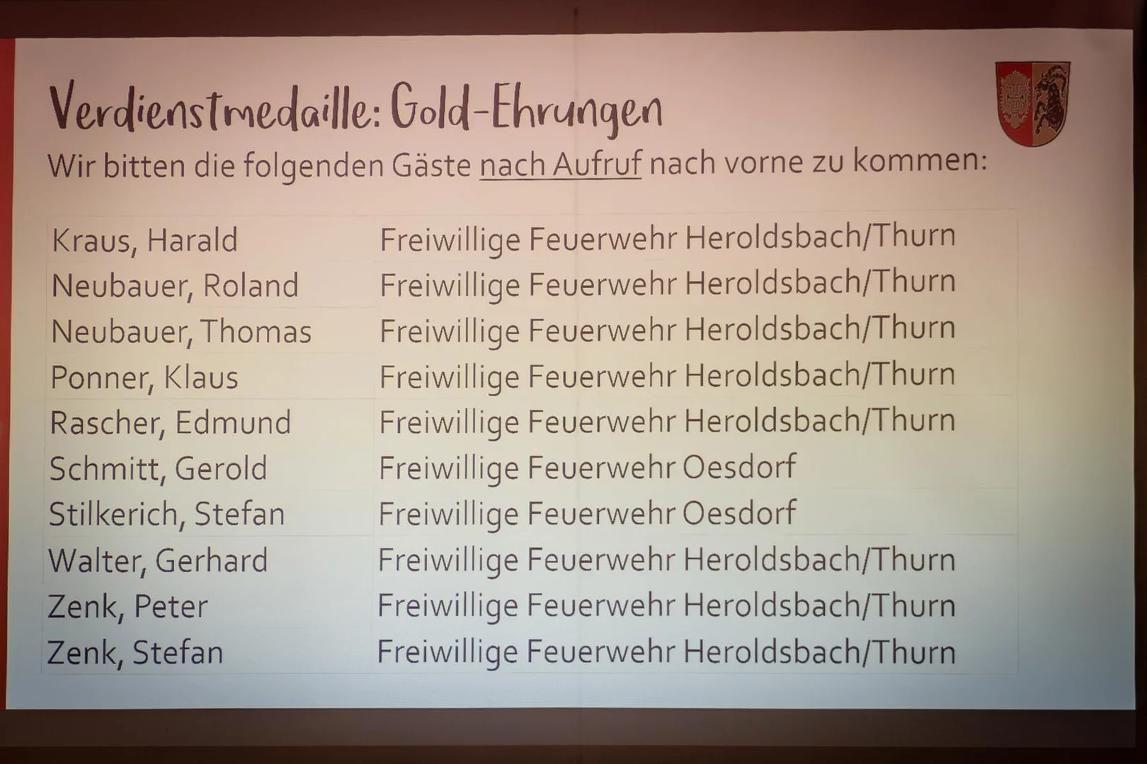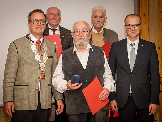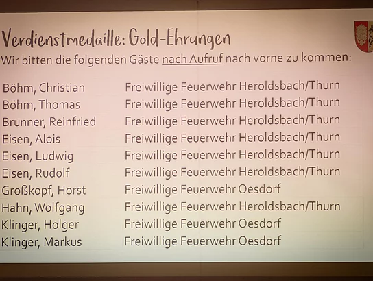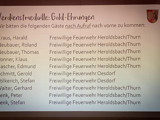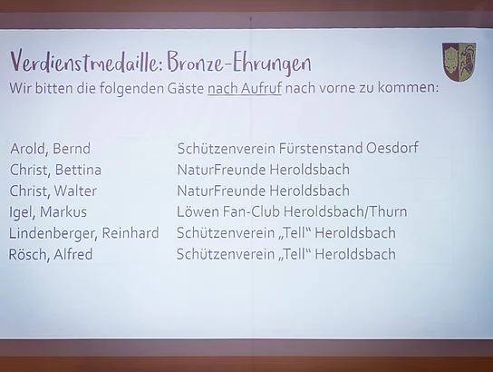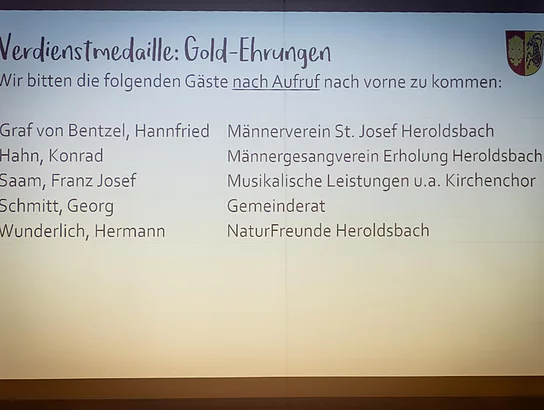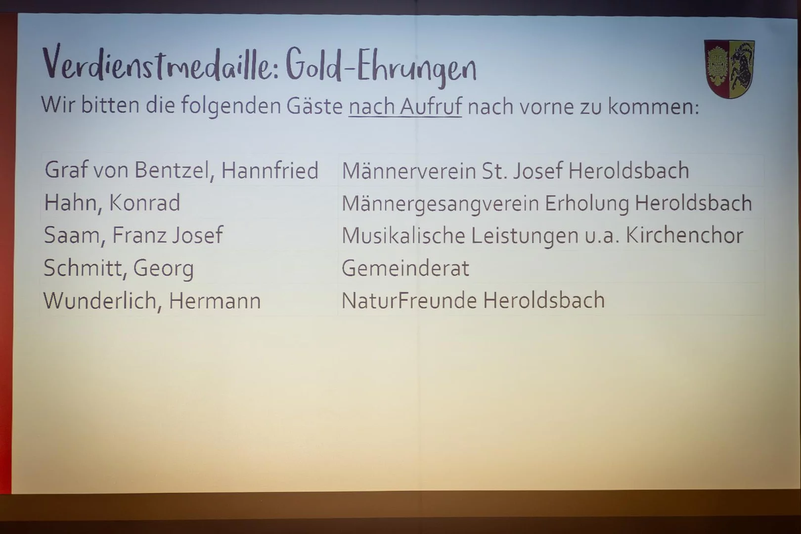 Franz Josef Saam für seine mehr als 60-jährigen musikalischen Leistungen, Hannfried Graf von Bentzel für eine über 60-jährige, Konrad Hahn für eine über 37-jährige sowie Hermann Wunderlich für eine über 45-jährige ehrenamtliche Tätigkeit in Heroldsbacher Vereinen. Georg Schmitt für seine mehr als 34-jährige Tätigkeit als ehrenamtliches Gemeinderatsmitglied.