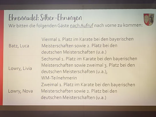 Besondere Würdigung ihrer sportlichen Erfolge im Karate erfuhren drei junge Menschen der Gemeinde für deren außerordentliche sportliche Erfolge im Karate, welchen im Rahmen der diesjährigen Ehrungsveranstaltung die gemeindliche Ehrennadel in Silber verliehen wurde. Diese Auszeichnung wird für außergewöhnliche Erfolge verliehen, die im Rahmen von Wettbewerben erzielt wurden – vor allem in sportlichen Disziplinen.