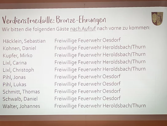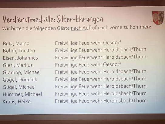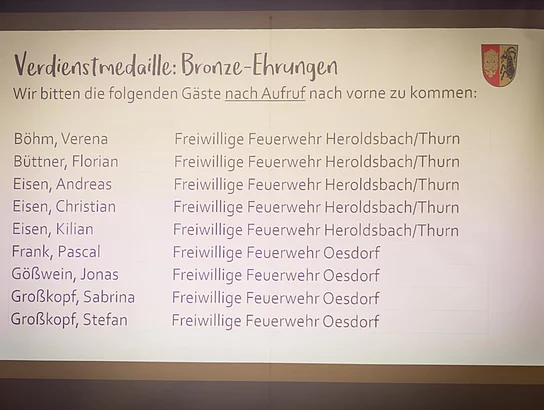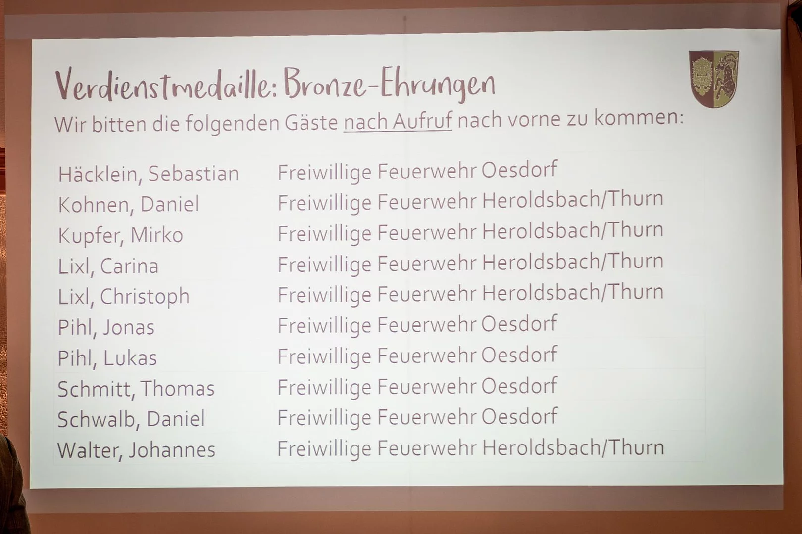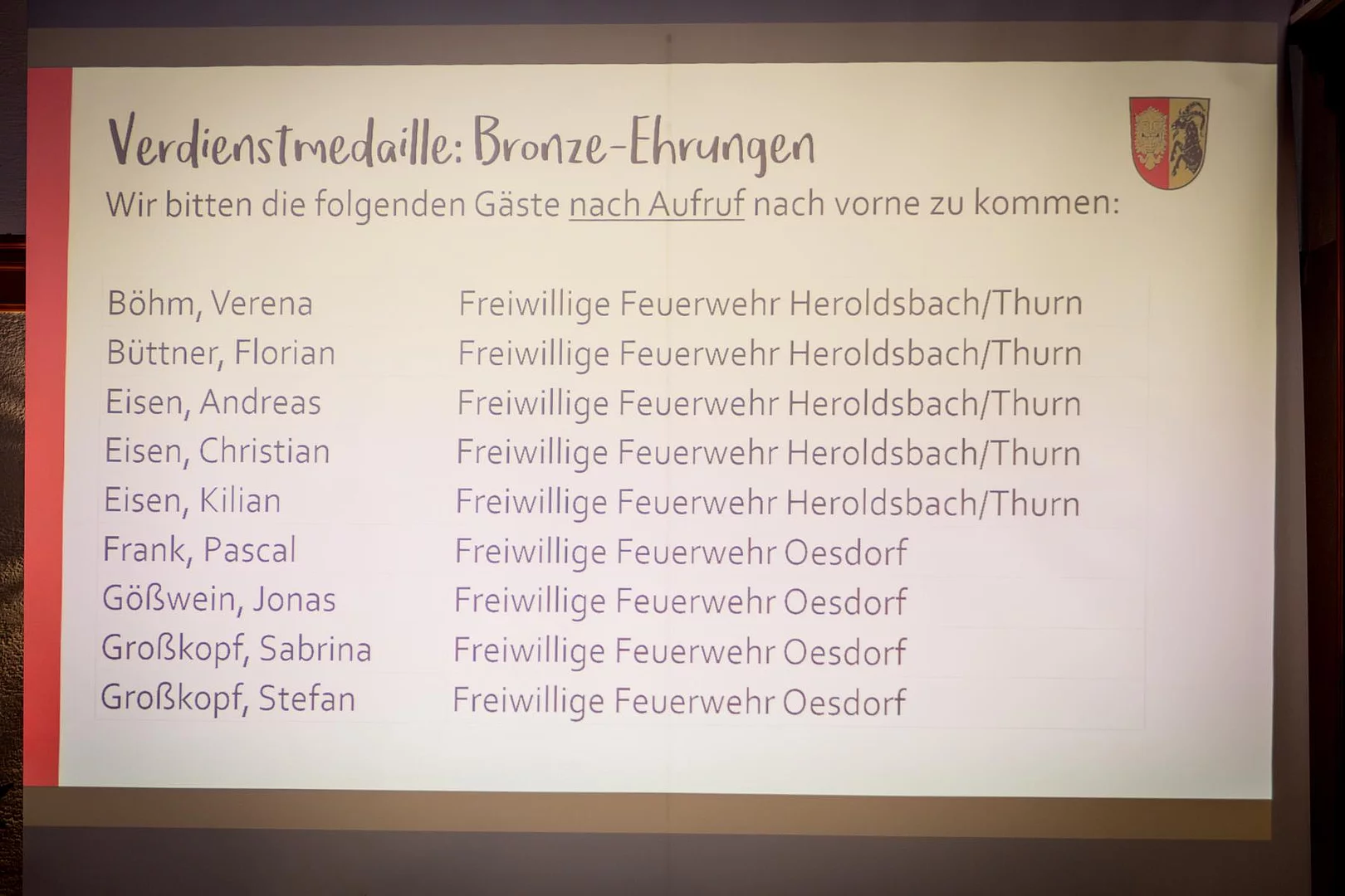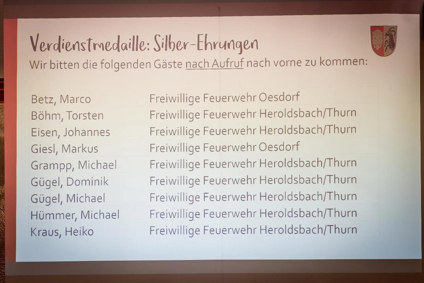 Verena Böhm, Florian Büttner, Andreas Eisen, Christian Eisen, Kilian Eisen, Pascal Frank, Jonas Gößwein, Sabrina Großkopf, Stefan Großkopf, Sebastian Häcklein, Daniel Kohnen, Mirko Kupfer, Carina Lixl, Christoph Lixl, Jonas Pihl, Lukas Pihl, Thomas Schmitt, Daniel Schwalb sowie Johannes Walter für eine mind. 10-jährige aktive Tätigkeit bei der Freiwilligen Feuerwehr.