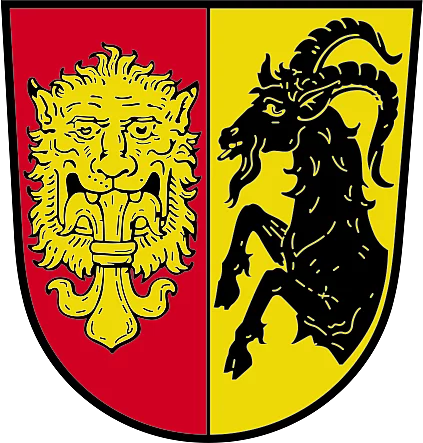 Gespalten von Rot und Gold; vorne ein herschauender goldener Löwenkopf mit einer goldenen heraldischen Lilie im Maul; hinten ein schwarzer Steinbockrumpf.